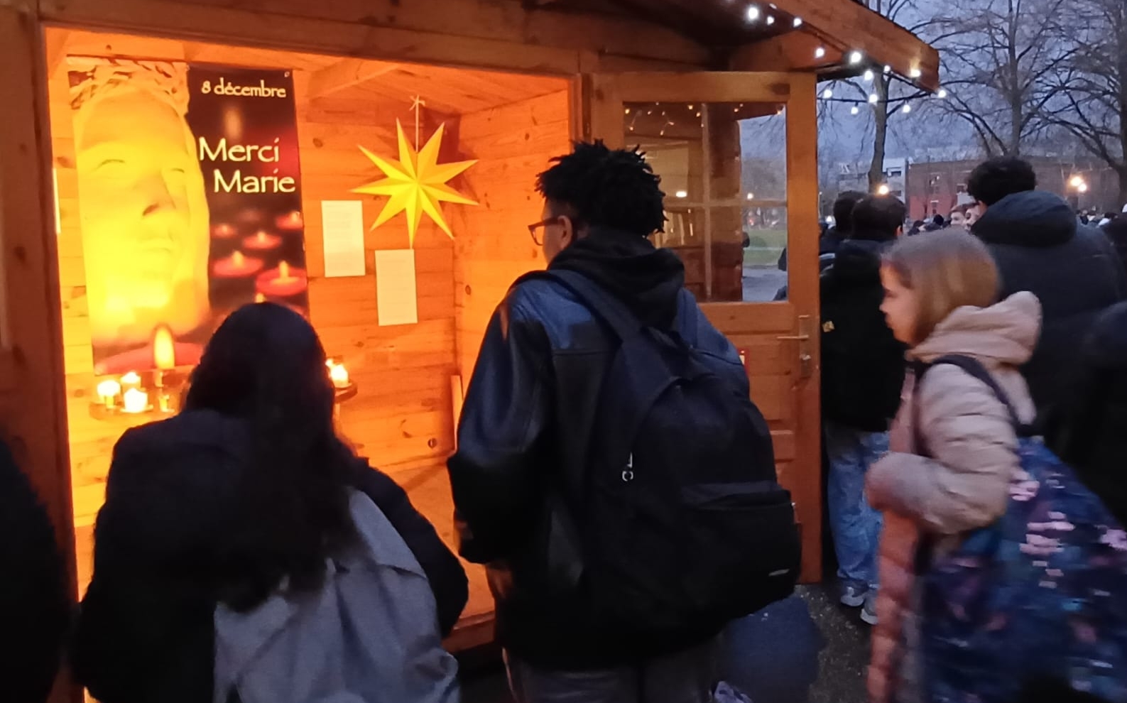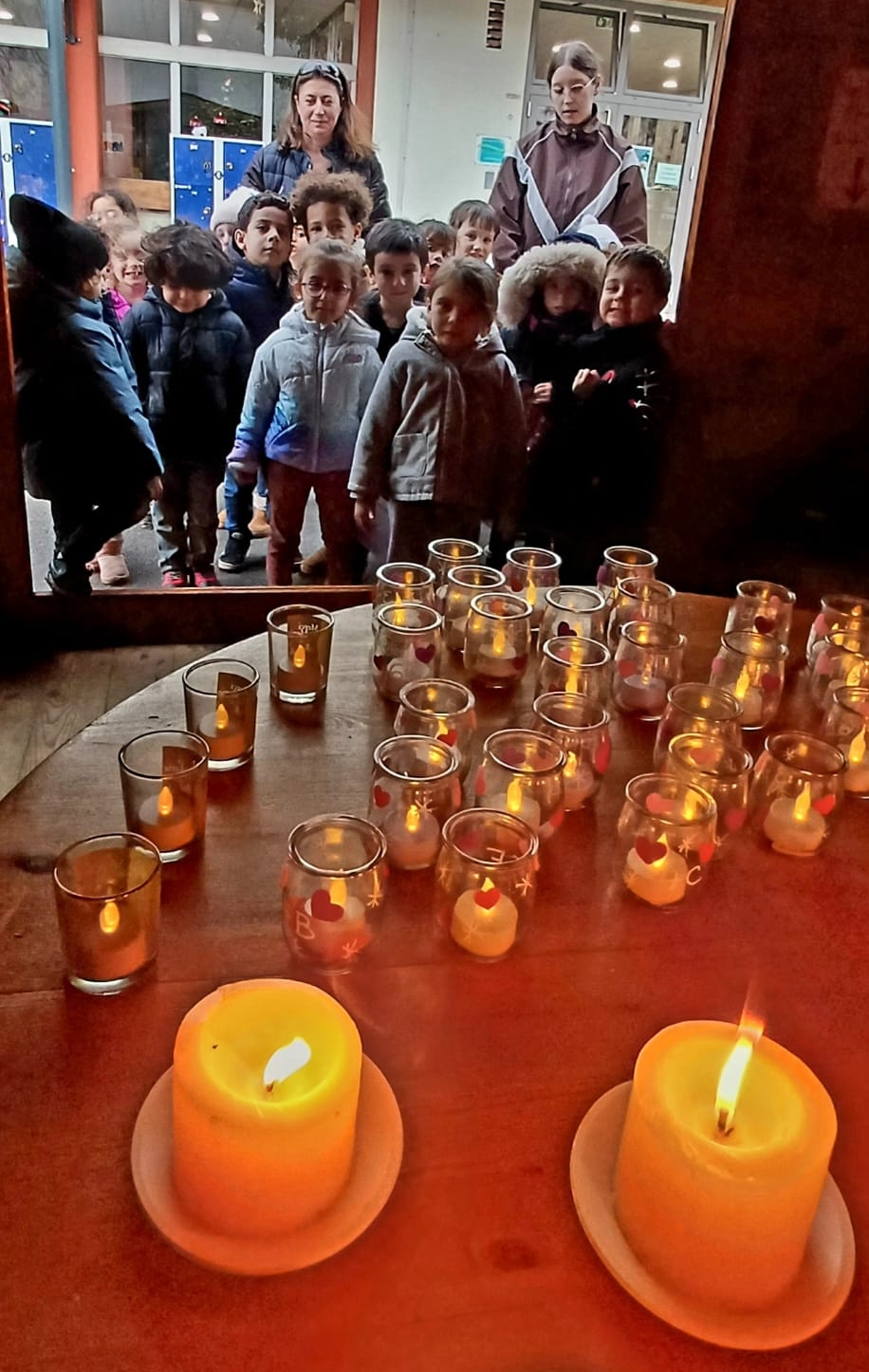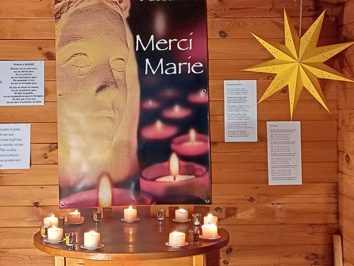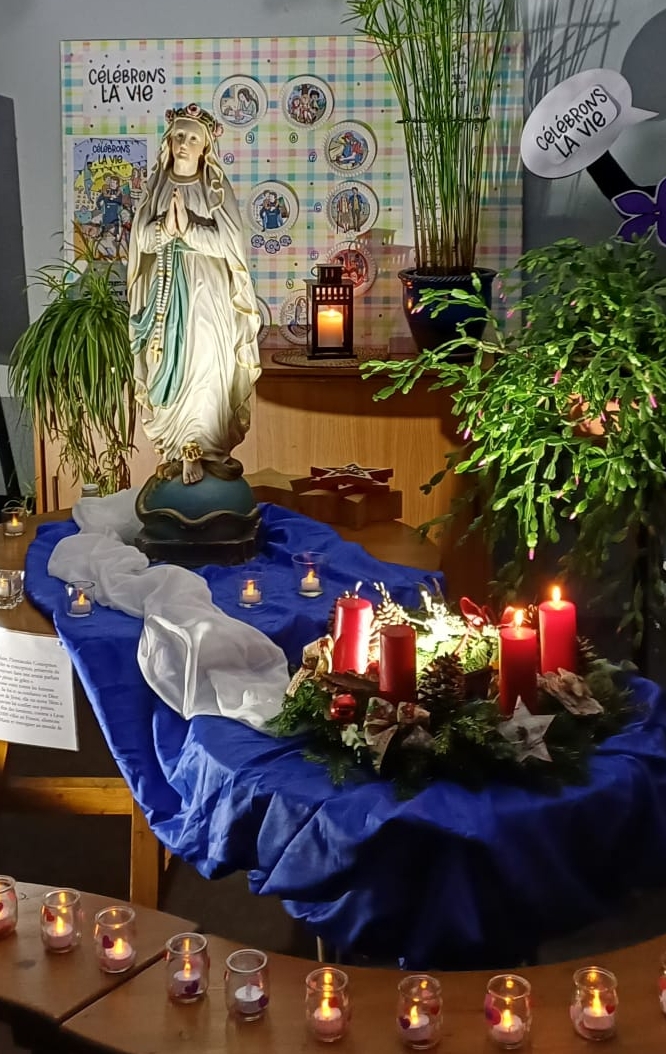 Nous avons fêté Marie le 8 décembre avec l'arrivée des élèves en lumière et en musique le matin. En début d’après-midi, toutes les classes ont écouté un message lu par M. Fournier et Mme Hassler puis les délégués de chaque classe se sont rendus à la chapelle éphémère, dans la cour, afin de déposer un lumignon. Les classes ont pu assister à ce moment grâce à la projection vidéo du direct dans toutes les salles.