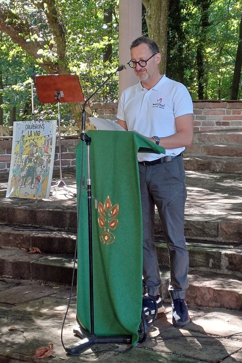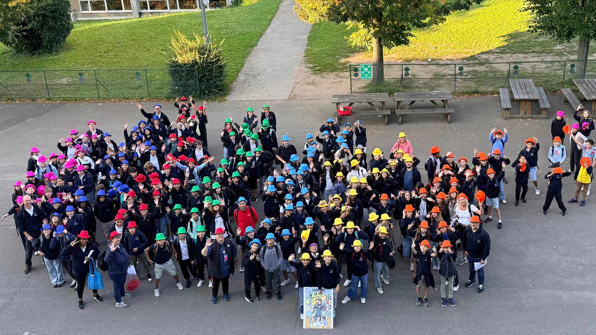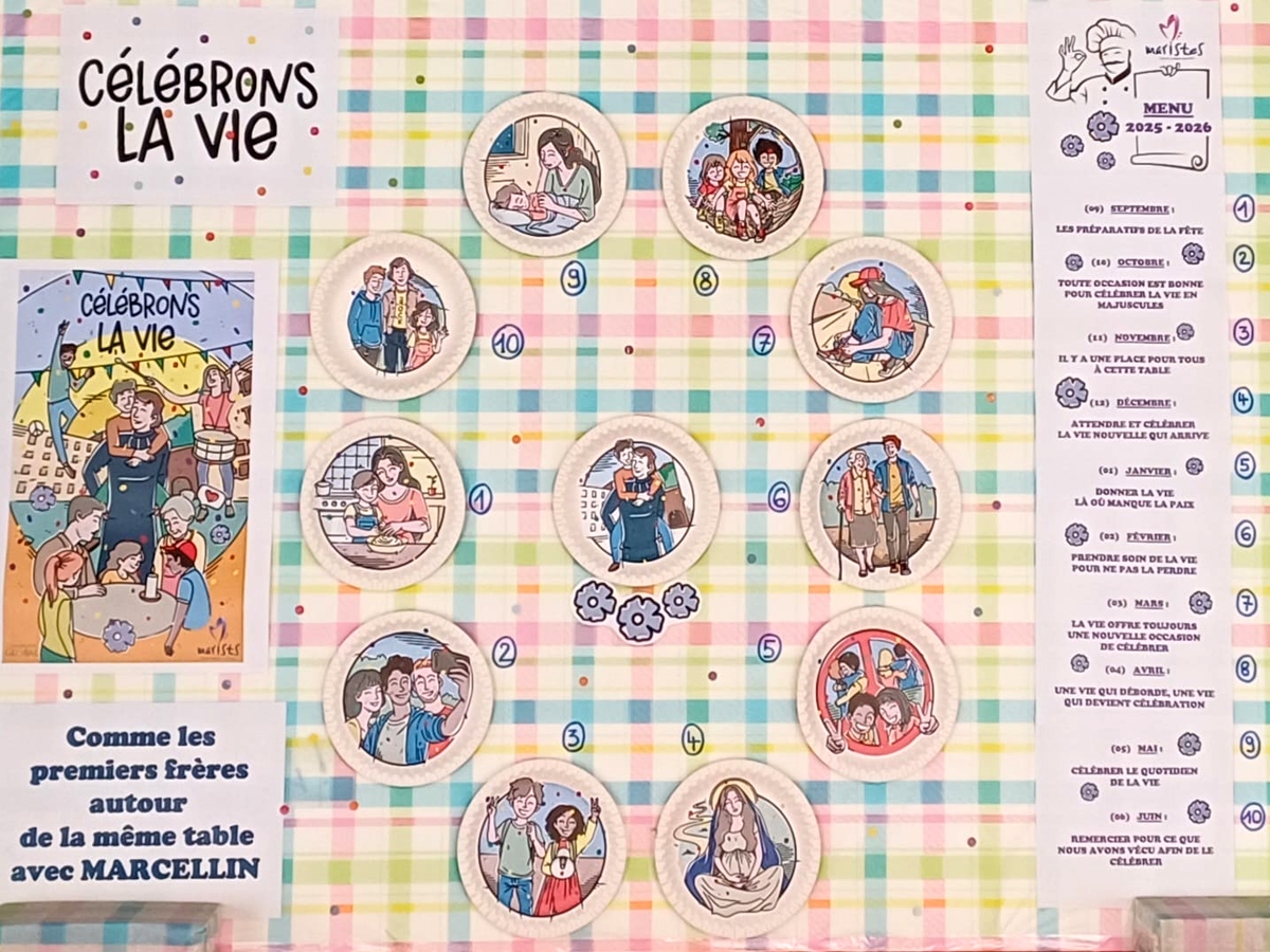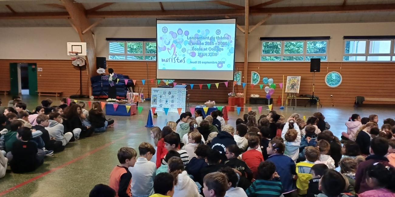 Le lancement du thème d’année, proposé par notre tutelle des Frères Maristes, a eu lieu sur toute une matinée pour tous les élèves de l’établissement par roulement : ils étaient conviés à une présentation de 20 minutes environ de l'affiche "CELEBRONS LA VIE" dans le gymnase du bâtiment Mangin (école primaire). Les symboles et les actions de l'année ont été explicitées par Elisabeth Hassler, adjointe de direction pour la pastorale scolaire, en présence de Iulian, notre prêtre référent, ainsi que des directions de l'école et du collège.
