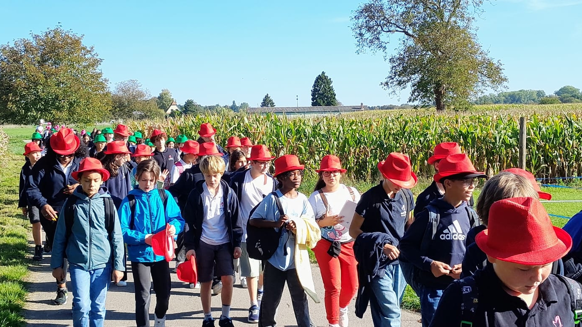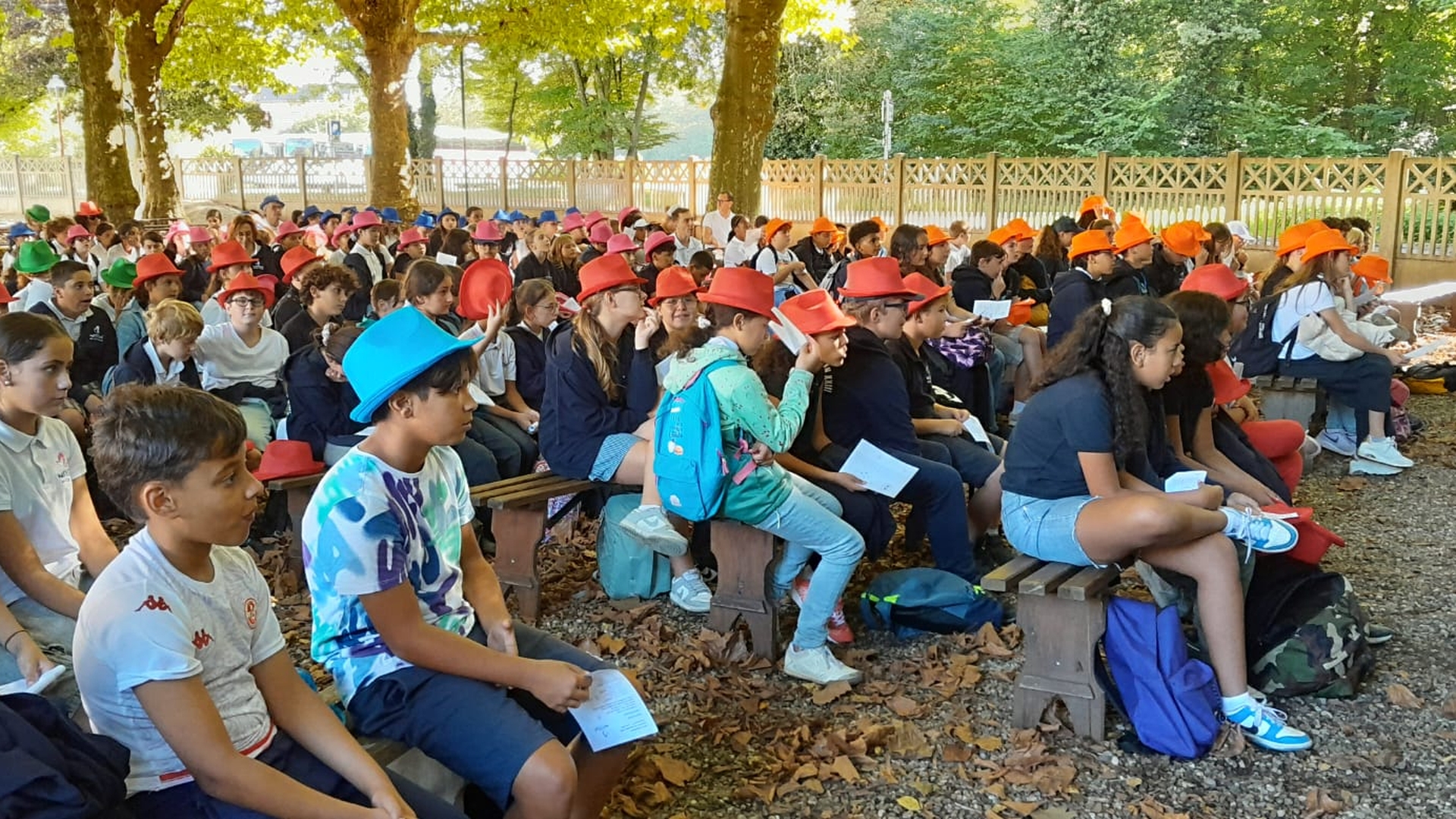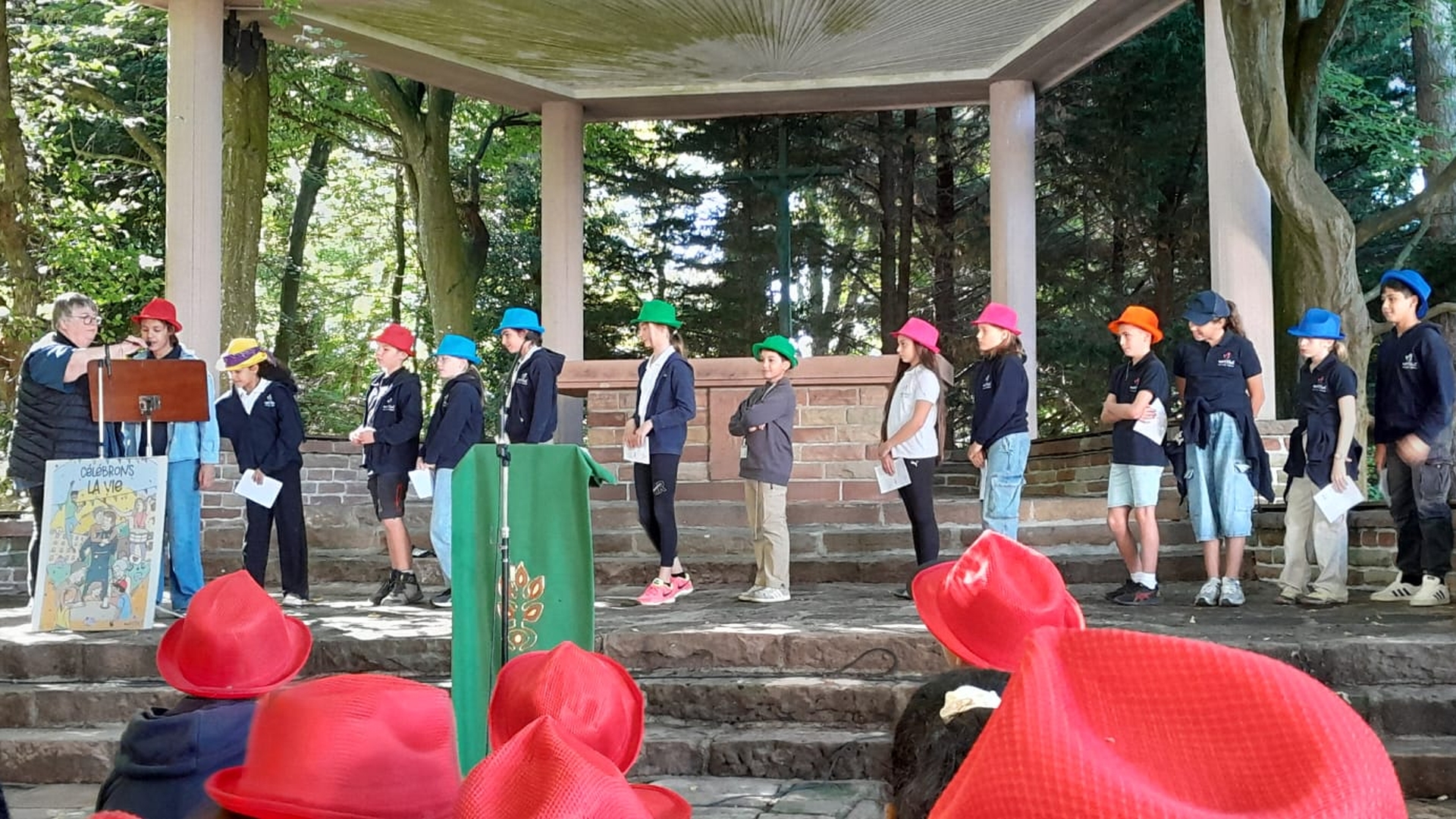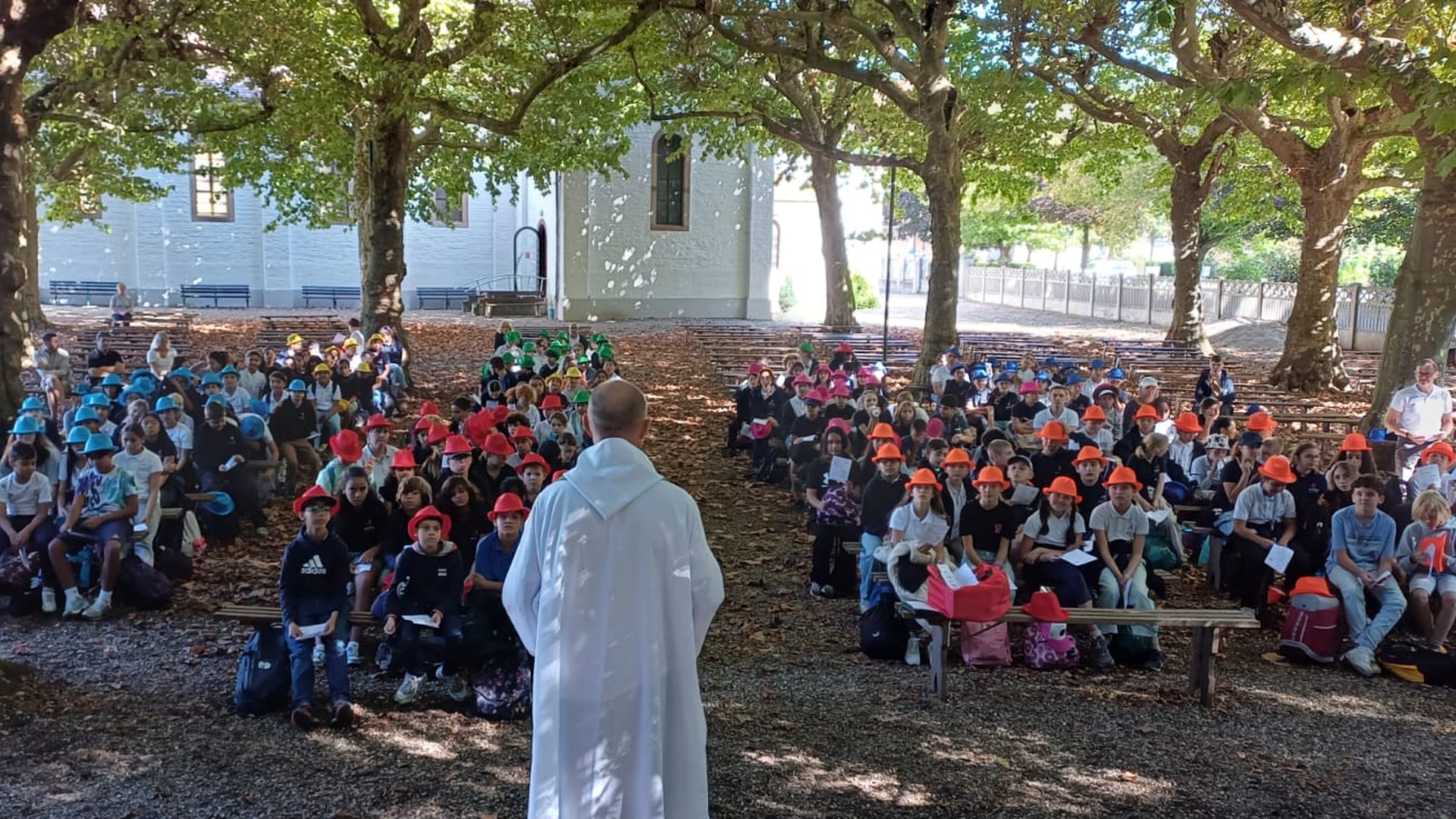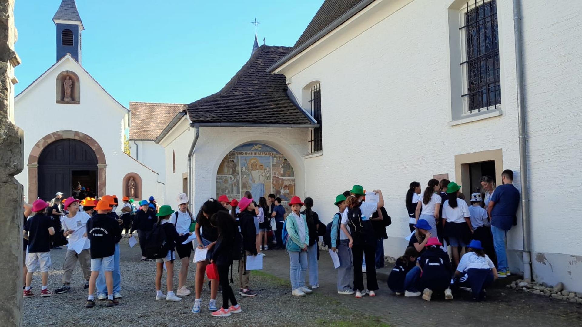 La traditionnelle journée de cohésion des sixièmes s'est déroulée cette année sous un magnifique ciel bleu à Neunkirch. Munis de leurs chapeaux colorés (une couleur par classe), les nouveaux collégiens, accompagnés de leurs professeurs principaux et de leurs professeurs de culture religieuse, ont pris la route du petit village bas-rhinois à travers champs. Arrivés à la Chapelle multiséculaire, ils ont assisté à une célébration en plein air assurée par le Père Iulian, prêtre référent de l'établissement, en présence de M. Fournier, chef d'établissement, M. Huntzinger, directeur-adjoint et de Mme Hassler, adjointe de direction pour la pastorale scolaire.